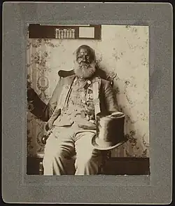 Jefferson Shields in uniform with medals and hat. Shields attended many reunions and was voted in as a member of the Stonewall Brigade at a reunion in Staunton, Virginia. He was buried with a military grave marker that reads "Jefferson Shields, Pvt. Co. H 27th Va. Inf., Stonewall Brigade, Confederate States Army" at Evergeen Cemetery, Lexington, Virginia. From the Liljenquist Family Collection of Civil War Photographs, Prints and Photographs Division, Library of Congress. Jefferson Shields was not enlisted in the Confederate Army.[50] The Sons of Confederate Veterans awarded him the honorary rank of private decades after his death. The Confederate Army did not allow slaves to enlist. His image, along with other "black Confederates", helped to reinforce the stereotype of the "happy slave" narrative according to historian Kevin M. Levin.[51]