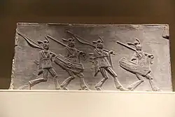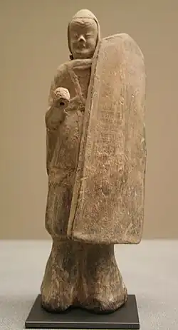 During the Northern and Southern dynasties period (420-589), a style of armour called "cord and plaque" became popular, as did shields and long swords. "Cord and plaque" armour consisted of double breast plates in the front and back held in position by two shoulder straps and waist cords, in conjunction with the usual lamellar armour. "Cord and plaque" wearing figurines are also often depicted holding an oval or rectangular shield and a long sword.[8] Types of armour had also apparently become distinct enough for there to be separate categories for light and heavy armour.[9]