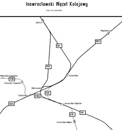 In 1933, the Polish Coal Trunk-Line was opened, connecting the Upper Silesian Industrial Region with the Port of Gdynia. Near Inowrocław, the trunk-line followed Chorzów Batory–Tczew railway, passing through the city and Inowrocław railway station.[2] Even during its construction, bypassing Inowrocław for freight trains was considered.[3]