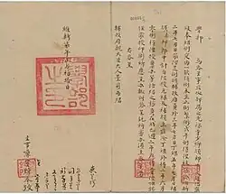 According to a document made on 09-01-Duy Tân 2 it was reported that the Học Bộ didn't have its own seals yet, so the Ministry of Education, Cao Xuan Duc, asked for a quan phòng seal for his office, 1 quan phòng seal for the Tham tri.[8] The ministry considers that the documents presented are in compliance with the implementation rules.[8] The seals were made by the Hữu ty and were made of bronze.[8] The Bộ ấn (部印) had the inscription Học Bộ chi ấn (學部之印) in seal script and was 9,0 cm x 9,0 cm.[19][8] Meanwhile, the kiềm ấn had the inscription Học Bộ (學部) in script and was 2,7 cm x 2,7.[19][8] The big seal was used to stamp the date while the smaller seal was used to close in important positions and erasing characters, among other tasks.[8]