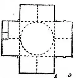 The underground part of the tomb has a plan in the shape of a regular cross with arms covered by arch-like stone ceilings, measuring 446x449 cm.[3] Each arm of the cross is covered with arch-like stone ceilings. The height of the ceilings from the ground is 186 cm, and the span of the arch crossing along the floor is 225 cm.[3] The central part of the cross is covered by a conical dome.[9] The height of the central part, which rises to the upper part of the conical dome, from the floor of the underground chamber is 327 cm.[3] The construction of walls, arches, and the dome involves carefully polished large stones. The selection of stones is notable, as stones of various heights were used: 25, 34, 33, 32, 29, and 40 cm.[3]