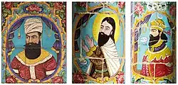 Tilework depicting (from left to right): Karim Khan Zand, Jesus, and Khosrow I Anushirvan. Located at the Ziyaiyan House, dated 1921