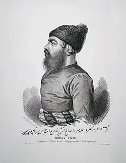 Mirza Saleh was amongst those who advocated for peace, alongside other prominent figures such as the chief scribe Neshat Isfahani; the head of the royal office Manuchehr Khan Gorji; and the foreign minister Mirza Abolhassan Khan Ilchi. In general, the peace party feared the capability of the Russian Empire and wanted armed conflict to be avoided at all costs. They were more accustomed to dealing with people from other cultures and knew more about Russia. To advise Fath-Ali Shah and formulate a course of action in this matter, the Council of Soltaniyeh gathered and finally resolved to launch full-scale warfare. Because of uncontrollable circumstances, the peace party at the shah's court was outmanoeuvred.[7] In the summer of 1826, full-scale war erupted between Iran and Russia.[8] The Iranians eventually lost, and were thus forced to sign the Treaty of Turkmenchay on 28 February 1828, in which they agreed to cede Erivan and Nakhichevan.[9][5] Mirza Saleh was amongst the figures who participated in the treaty negotiations on behalf of Iran.[1]
