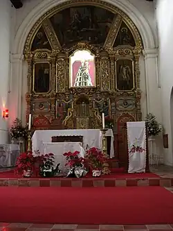 On October 19, 1697, Salvatierra, with nine armed men, disembarked from the galley Santa Elvira at the place that the Indians called Coruncho (Cochimi: red-coloured mangrove).[1][2] The site was distinguished by "a small patch of stunted shrubbery and a spring of fresh water, both rare luxuries in that inhospitable country". In the first days after their arrival, the missionary erected a modest structure that served as a chapel, to the front of which they affixed a wooden cross. On October 25 they carried the image of the Virgin of Our Lady of Loreto in a solemn procession, a ritual of faith that claimed the area as Spanish territory. Thus began the Mission Loreto.[3]