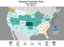 Wetter than normal conditions persisted into the spring with precipitation concentrated in the western and northern regions of the Mississippi River Basin. The conterminous United States recorded the fifth wettest meteorological spring (March 2019 - May 2019) during the 1895-2019 period of record, with an average of 9.92 inches (252 mm) of precipitation.[13] Kansas experienced its wettest meteorological spring receiving 14.31 inches (363 mm) of precipitation of which 10.51 inches (267 mm) fell in May.