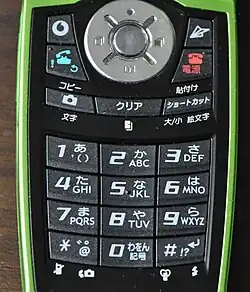 Input on mobile phones is performed using hiragana, katakana, kanji, and alphanumeric characters. A character mode function allows the user to select from among these types of character input. Kanji characters are selected by first inputting hiragana, then converting (変換, henkan) the characters. Kana characters are laid out on the mobile phone keys in the 50 character table format: A-column characters on 1 key, Ka-column characters on the 2 key, etc.