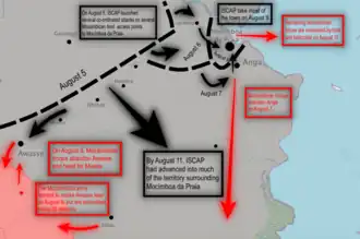The offensive actions started on August 5, 2020 when IS-CAP insurgents attacked the villages of Anga, 1 de Maio, Awasse, and the outskirts of Mocímboa da Praia on the same night.[4] On August 6, IS-CAP attacked two military bases in Mocímboa da Praia, killing or wounding 50 soldiers and seizing dozens of rifles and RPG-7s. The government also repeated an attempted assault on the city, killing 16 insurgents. On August 8, the government pulled out of Ntotue, a strategic town in between Mocímboa da Praia and Awasse.[4] On August 9, IS-CAP took the town of Awasse and were in control of the outskirts of Mocímboa da Praia. A well-carried out ambush took place on Sunday just before Awasse, killing 55 recruits and injuring 90 more.[4][3] By the 10th the city of Mocímboa da Praia was completely cut off from food and ammunition. South Africa's Dyck Advisory Group attempted to airdrop ammunition onto the city under siege but dropped it too far from the Mozambican military. As a result, the Mozambicans suffered casualties trying to recover the supplies.[3] On Tuesday, August 11, the Mozambican army, outnumbered and low on ammunition, was forced to retreat by boat from the city. In the retreat, an HV32 interceptor vessel was hit with an RPG and sank. 55 soldiers were killed in running battles during the siege of the city.[3][1] The insurgents lost a total of 70 men during the battle for the city.[5]