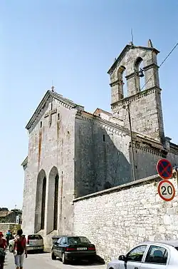 The church, in the late Romanesque style and with Gothic adornments, was built in 1314.[1] Completed by the architect Jakov Puljanin (Jacobus de Pola), it was designed in accordance with the rules issued in Narbonne in 1260, including a typical rectangular floor plan of the church with a square sanctuary, a single-walled bell tower, a cloister and a monastery with rooms for the friars, a capitular hall, a refectory and a sacristy that connects the monastery with the choir.[2]