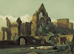 Evidence is lacking on Robert's participation as a patron of Dryburgh. He certainly used the abbey as a base in July 1316 while conducting raiding expeditions into Northumberland.[44] In retaliation for Bruce's raids in July 1322, Edward II of England took his army north in August only getting as far as Edinburgh. The English army retreated through Lauderdale and looted and burned both the abbeys of Melrose and Dryburgh.[45] Melrose Abbey's reconstruction was generously provided for by Robert[46] while Dryburgh's needs seem to have been ignored.[47] It is unclear why Bruce chose to be so ungenerous towards the canons of Dryburgh; Melrose was granted £2000 by Robert while Dryburgh received the confirmation of a pre-existing rent of 20 shillings per annum[47][48]