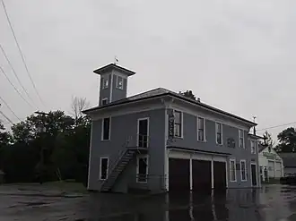 The museum building is a rectangular two-story wood-frame structure, set on the east side of Main Street, just south of Phillips Brook, which is the outlet of nearby Hebron Pond. The building is set on a slate pier foundation, whose northeast corner projects over the stream. This corner is the location of a four-story hose-drying tower, arranged so that drying firehoses can drain directly into the stream. The building has a hip roof, as do the tower and a southern 1+12-story addition. The main facade faces west, and is divided into six bays. The three left bays have double-leaf equipment doors with a decorative frieze above, and symmetrically placed sash windows on the second floor. The next two bays have sash windows on the first floor, the right one with a window above as well. The rightmost bay has the building's personnel entrance and a smaller sash window above. Below the roofline is a soffit supported by scrolled brackets.[2]