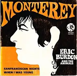 "Monterey" is a 1967 song by Eric Burdon & The Animals. The music and lyrics were composed by the group's members, Eric Burdon, John Weider, Vic Briggs, Danny McCulloch, and Barry Jenkins. The song provides an oral account of the June 1967 Monterey Pop Festival, at which the Animals performed. Burdon namedrops several of the acts who performed at the festival such as the Byrds, Jefferson Airplane, the Who, the Grateful Dead, and Jimi Hendrix. In 1968, two different video clips of the song were aired.