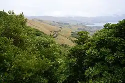 Montgomery Park Scenic Reserve is located in approximately the geographical centre of Banks Peninsula, about 40 kilometres (25 mi) southeast of Christchurch. The small parking area below the reserve is at the crest of the Akaroa Highway that leads from Christchurch to Akaroa Harbour, about 500 metres (550 yd) along the Eastern Bays Summit Road from Hilltop.[1] The reserve is 16 hectares (40 acres) in size, tucked into the southeastern face of a volcanic escarpment facing Akaroa Harbour.[2]