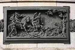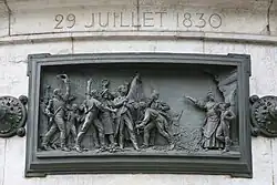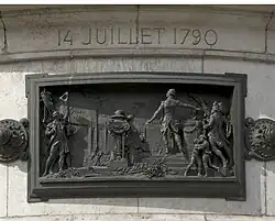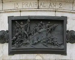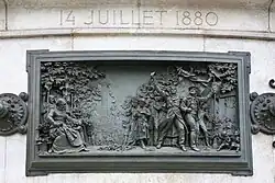 The stone pedestal is surrounded with twelve high reliefs in bronze, made by Léopold Morice.[2] Connected with rosettes and arranged at eye level, they constitute a chronology of events marking the history of the French Republic, between 1789 and 1880 :