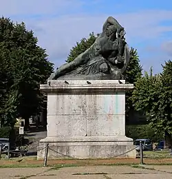 The Monument to the Fallen (Italian: Monumento ai Caduti) is a Fascist-era monument located in the center of Piazza San Francesco in Pistoia, Tuscany, Italy. The monument was meant to recall those fallen in the battles of World War I between 1915 and 1918. Though completed some years before, the bronze statue was only installed in 1926 with the King in attendance.[1][2] The bronze statue shows a muscular, partly nude, semi-recumbent man sheltering a statue of Victory as he glares to the distance. The statue is on a marble base with flanking bas-reliefs depicting a winged victory and a mother and child sharing bundles of wheat (fasces). The sculptor, Silvio Canevari (1891–1953), would go on to sculpt statues of athletes for the Stadio dei Marmi in Rome. Many of this statues, including The Pugilist and his Monument to Victory (commemorating those who fell in the wars of Africa) at Civita Castellana, also focus on the athletic man in combat.[3]