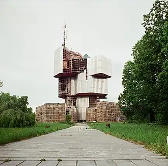 The monument became a popular site for school trips and other visitors, largely due to its observation deck.[40] However, after the Croatian War of Independence began in 1991, the monument, which was located in an occupied part of the country, was repurposed for military use along with the surrounding park by the Yugoslav People's Army (JNA).[41] The interior was converted into a base that housed a signal corps, a military police company, and an air defense platoon; a training center; and a storage facility for ammunition, weapons, and explosives.[42] A makeshift hospital was situated 100 meters (330 ft) away from the monument, equipped with around 50 hospital beds and an operating room.[43] The selection of Petrova Gora for a wartime hospital was influenced by its historical significance as the site of the Partisan hospital during World War II.[44]