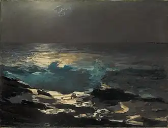 Moonlight depicts a nighttime seascape outside of Homer's studio in Portland, Maine. The tiny spot of red pigment on the horizon denotes the lighthouse on Wood Island, to the south of Prouts Neck, Scarborough, Maine.[1]