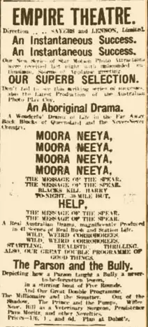 highly exciting drama. The scenes are thoroughly Australian, and typical of the bush and backblock township life of Queensland, where the incidents of the drama were carried out. A strangely fantastic effect was obtained by the introduction of a tribe of genuine Australian alboriginals, whose grotesque war-painted bodies added to their weird corroborées. This is the first film introducing the Australian aboriginals in their native haunts, and war dances.[23]
