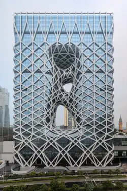 Morpheus is a neo-futurist luxury hotel in Macau, Special administrative regions of China that is operated by Melco Resorts & Entertainment.[2] Opened in June 2018, TIME describes it as "the world’s first free-form exoskeleton-bound high-rise: a grid of steel envelops 40 stories of glass with a fluidity inspired by Chinese jade carving." The interior has a gaming floor, a rooftop pool, a modern-art gallery, and restaurants by chefs such as Alain Ducasse.[2]
