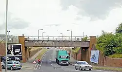 In an attempt to stimulate Oxford suburban traffic, the Great Western Railway opened three motor halts on the line, one of which was to be situated to the south of the railway bridge over Garsington Road (now classified the B480). The station was named Garsington Bridge Halt and its opening was approved by the Board of Trade in December 1907. The first services, operated by GWR steam rail motors, ran on 1 February 1908.[4] As with the other halts, Garsington Bridge had a single platform, 150 feet (46 m) long, with a 20-by-70-foot (6 m × 21 m) corrugated iron passenger shelter.[5] Steps linked the halt with Garsington Road.[6] The halt remained open for only seven years, being closed in 1915 as a First World War economy measure.[2]