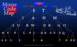 This visual map of Dits an Dahs is arranged from top to bottom by character length (e.g. first layer is just one sound — a dit or a dah for E or T, the second layer contains letters formed by two sounds, the third layer by three sounds, etc.) Dits to the Left and Dahs to the right.