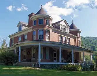 Morton House, also known as Morton Mansion, is a historic home with Queen Anne style located at Webster Springs, Webster County, West Virginia that dates to 1912. It is a massive red brick dwelling set on a solid stone foundation, with a hipped roof and features a pair of 2+12-story turrets and each is topped with a conical shingled roof and capped with wooden finials. It also has a wraparound porch around 3/4 of the house.