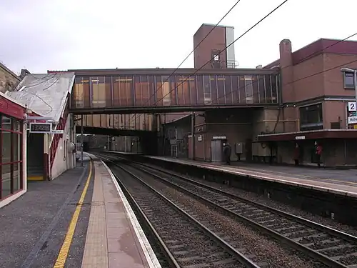 ![]() Motherwell railway station at Platforms 1 and 2. Trains running on the West Coast Main Line stop here. | |||||