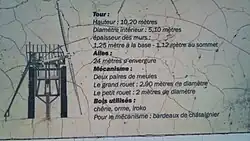 The tower is 1.25 metres (4 ft 1 in) thick at the base and 1.12 metres (3 ft 8 in) thick at the top. It is 10.20 metres (33 ft 6 in) tall and has an internal diameter of 5.10 metres (16 ft 9 in) The Common sails have a span of 24.00 metres (78 ft 9 in). They are carried on a wooden windshaft with a cast iron poll end. The windshaft carries a head wheel of 2.90 metres (9 ft 6 in) diameter and a tail wheel of 2.00 metres (6 ft 7 in) diameter. One of the two pairs of millstones is 2.00 metres (6 ft 7 in) diameter.[2]