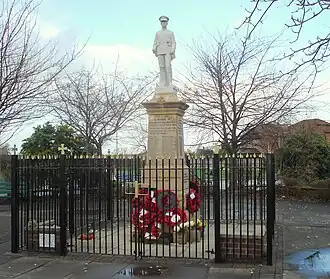 The memorial consists of the statue of a soldier in uniform standing on a plinth and a pedestal. It stands about 7 metres (23 ft) high.[1] At the bottom is a square base, on which is another base carved to resemble boulders. On this stands a pedestal with a cornice and a plinth; all these are in yellow sandstone.[2] On the plinth is the marble statue of a soldier. He is in the uniform of the Cheshire Regiment, and is standing at ease, holding a rifle.[1] Behind the soldier is a shattered tree trunk.[3] The memorial is surrounded by paving, and a wrought iron fence consisting of railings and ten posts. It is painted black, and on the posts are crosses painted gold.[2]