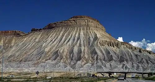 Mt. Garfield[3] is the high point of the Book Cliffs, east-northeast of Grand Junction, and overlooking the town of Palisade. Two classic hiking trails ascend the mountain. The mountain was named after President James Garfield a year after Garfield's death. The mountain is composed of Mesaverde Group overlaying Mancos Shale.