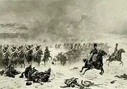 The rigors of the Polish winter, the bad roads and the extreme poverty of certain regions brought about considerable misery for both sides and rendered proper reconnaissance virtually impossible. After some initial maneuvering and minor engagements, the first major battle occurred at Eylau. Here, the Grande Armée gave battle, despite being seriously outnumbered[7] and with the expected reinforcements failing to materialise, Napoleon's position was looking increasingly perilous. The Emperor thus ordered Marshal Murat to launch the entire reserve cavalry into a massive charge. At first, Murat led forward two dragoons and one cuirassiers divisions and these men pierced the Russian line and carried on beyond, only to find themselves behind enemy lines and in serious danger of being surrounded. As a result, the Emperor ordered Marshal Bessières to help the stranded reserve cavalry and thus a second cavalry charge ensued, spearheaded by the Chasseurs à Cheval and followed by the heavy cavalry of the 5th cuirassiers and Grenadiers à Cheval. Commanding the horse grenadiers was Colonel Lepic who superbly led two squadrons of the regiment, as they stormed through the first and second Russian lines, stopping only in front of the enemy reserves. As the handful of horse grenadiers arrived in front of this third enemy line, they were all but surrounded and the Russians at once demanded that they surrender. Lepic defiantly retorted: "Have a look at my men and tell me if they look like ones who want to surrender!" and he immediately ordered a charge, hacking his way back to his own lines. The regiment lost 4 officers dead and 14 officers wounded, as well as a large number of troopers, but the charge of the Guard cavalry did allow their fellow reserve cavalry to break their encirclement and get back to their original positions. The French would go on to draw the bloody Battle of Eylau later that evening.[8]