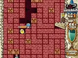 Drill Land introduces five gameplay modes, themed as "attractions" in an amusement park.[4] Upon selecting one, the player can select the difficulty of the stage before progressing to the main game.[3] Completing an attraction will award the player with a stamp, and collecting all five stamps from each ride will allow the player to engage in a boss fight with Dr. Manhole in the middle of the park, which when defeated will unlock the next level. The five game modes include: Drill Land World Tour, which has the standard Mr. Driller gameplay,[3] The Hole of Druaga, a parody of Namco's own The Tower of Druaga where the player needs to retrieve a key to open a door,[3] Horror Night House, where the player needs to inject ghost-filled blocks with Holy water,[3] Drindy Adventure, which features traps such as rolling boulders and spikes,[3] and Star Driller, based on the Space Stage in Mr. Driller G featuring flashing "Star Blocks" that disappear after a brief moment.[5]