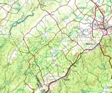 Mud Creek rises in southern Habersham County, as North Fork Mud Creek and South Fork Mud Creek. North Fork originates north of Cornelia and just east of U.S. Route 23. South Fork originates in the center of Cornelia on South Main Street.[2] Both forks run east-northeast for approximately 3 miles, cross US 23 in the process, and meet just south of State Route 105 to become Mud Creek. Mud Creek then flows west-southwest, running parallel to first the Soque River, then the Chattahoochee River (after the confluence of the two rivers) on the north, and parallel to US 23 on the south. The creek heads toward State Route 384 for approximately 2 miles, crosses that state route, and continues in the direction of Hall County for several additional miles, picking up Perkins Branch, Wooten Branch, and several unnamed branches, all from the north. Shortly after crossing into Hall County, Mud Creek is joined by Little Mud Creek, which rises just south of Cornelia, parallels Mud Creek to the southeast for the entire journey through Habersham County, and drains the southeastern half of the watershed. Approximately 2.7 miles further on, the creek flows into the Chattahoochee River, about 5 miles north of Lula.[3]