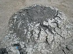 A mud volcano or mud dome is a landform created by the eruption of mud or slurries, water and gases.[1][2][3] Several geological processes may cause the formation of mud volcanoes. Mud volcanoes are not true igneous volcanoes as they do not produce lava and are not necessarily driven by magmatic activity. Mud volcanoes may range in size from less than a meter high and 1 or 2 meters across, to 700 meters tall and 10 kilometers wide.[4] Smaller mud exudations are sometimes referred to as mud-pots.