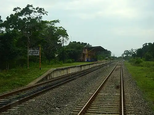 Murukandy railway station (Tamil: முறிகண்டி தொடருந்து நிலையம் Muṟikaṇṭi toṭaruntu nilaiyam, Sinhala: මුරුකන්ඩි දුම්රිය ස්ථානය) is a railway station in the town of Murukandy in northern Sri Lanka. Owned by Sri Lanka Railways, the state-owned railway operator, the station is part of the Northern Line which links the north with the capital Colombo. The popular Yarl Devi service calls at the station. The station was not functioning between 1990 and 2013 due to the civil war. The Northern Line between Omanthai and Kilinochchi, which includes Murukandy, was re-opened on 14 September 2013.[1][2]