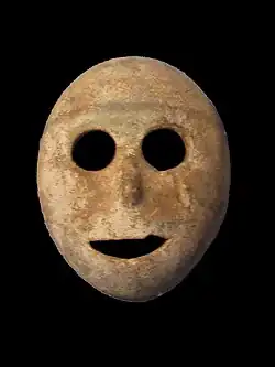 Stone mask in the Musée Biblique purportedly dating the Pre-Pottery Neolithic, c. 7000 BCE.