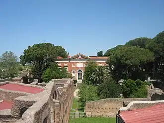 The museum was built by Pope Pius IX, who in 1865 had to readapt a fifteenth-century building used as a store to create a city museum. Contained in the museum are numerous archaeological objects which came to light during a long period of excavations. The collection includes, for example, a collection of portraits of famous people from ancient Ostia, including philosophers and members of the royal family, such as busts depicting Asclepius and Volcacius Myropnous,[1] a portrait of Faustina the Elder and the head of Trajan. The museum also has a large collection of sculptures, including the statue of Perseus holding the head of Medusa, the sculptural group of Mithras slaying the bull, and other works. There are other examples on display of great interest, such as small groups in marble depicting Cupid and Psyche and other subjects, and in another section of the museum, sarcophagi and reliefs. On display are also examples of wall paintings from different burials and emblems of polychrome mosaics, such as the Christ Blessing. These works of great historical and artistic value, are then supported by a collection of minor works such as crafts, glass, and even teaches some at the shop, and some interesting facts, such as the marble slab found in the temple of Bellona, on which are carved two pairs of feet opposite, probably a votive object.[2]