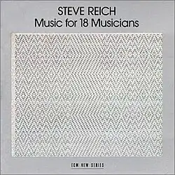 Music for 18 Musicians is a minimalist album by composer Steve Reich recorded between April–December 1976 and released on the ECM New Series in April 1978—his first of three releases for the label. The ensemble features eighteen musicians, including Reich himself playing the part of piano and marimba, playing Reich's titular composition.[1][2]