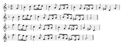 The term "Binary Form" is used to describe a musical piece with two sections that are about equal in length. Binary Form can be written as AB or AABB.[13] Using the example of Greensleeves provided, the first system is almost identical to the second system. We call the first system A and the second system A′ (A prime) because of the slight difference in the last measure and a half. The next two systems (3rd and 4th) are almost identical as well, but a new musical idea entirely than the first two systems. We call the third system B and the fourth system B' (B prime) because of the slight difference in the last measure and a half. As a whole, this piece of music is in Binary Form: AA′BB′.[13]