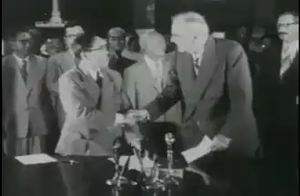 On August 8, 1953, Foreign Minister Byeon Yeong-tae and US Secretary of State John Foster Dulles shared a handshake after signing the treaty. Watched by President Syngman Rhee.