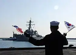 South Korean soldier welcomes American vessel to port.