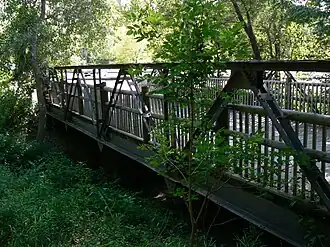 The Mynard Road Bridge, now located near Ashland, Nebraska, is a historic Warren truss leg bedstead bridge that was built in 1900. It was probably built by J.R. Sheeley and Company, of Lincoln, Nebraska and was listed on the National Register of Historic Places in 1992.[1][2] The 50-foot (15 m) Mynard Road Bridge was the longest of its engineering type remaining in the state of Nebraska when the historic inventory was done in 1992, and was still used for vehicular traffic at that time.[2] The bridge was originally situated on the Maynard Road and was built to span an unnamed stream, 4.7 mi (7.6 km) southeast of Louisville, Nebraska.[2] In 2000, the bridge was relocated to be used as a pedestrian bridge at the Lee G. Simmons Conservation Park and Wildlife Safari.[3]