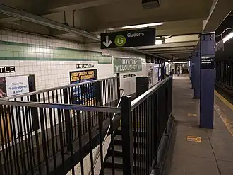 The platforms each have one same-level fare control area at their north ends.[5] The one on the Church Avenue-bound side has a bank of three turnstiles, token booth, and staircase going up to the northwest corner of Marcy and Myrtle Avenues. The one on the Queens-bound side is unstaffed, containing two High Entry/Exit turnstiles, one exit-only turnstile, and a short double-wide staircase that goes up to a short landing before a standard perpendicular staircase goes up to the northeast corner of Myrtle and Marcy Avenues.[5][6] Two staircases on both platforms adjacent to fare control go down to a crossunder to allow a free transfer between directions.