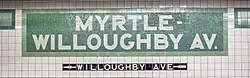 This underground station has two tracks and two side platforms.[5] Both platforms have a light green trim line on a dark green border that is cut up into numerous sections due to the large mosaic name tablets, which read "MYRTLE - WILLOUGHBY AV." on two lines in white sans serif lettering on a dark green background and a light green border. There are small tile directional signs in white lettering on a black background pointing to fare control below the name tablets, and station name signs in the same style run below the trim line, alternating between "MYRTLE" and "WILLOUGHBY". Vent chambers are located on the tile wall. Both platforms have blue I-beam columns at regular intervals with alternating ones having the standard black station name plate in white lettering.