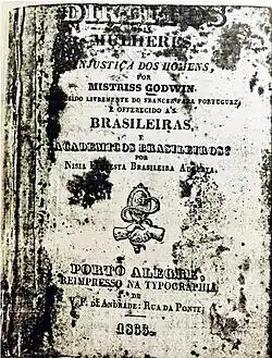 It was this book that gave Floresta the title of the precursor of feminism in Brazil, and even Latin America itself, since there are no records of previous texts made with the intentions of educating and reflecting on one’s society in relation to feminism.[2] Floresta did not stop there; in other books she continued to highlight the importance of women's education for both women and society. Son Conselhos a minha filha (1842), Opúsculo humanitário (1853), where the author condemns the educational training of women, in Brazil and in other countries, and A Mulher (1859) are all examples of this.[2]
