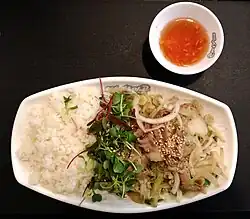 - Cơm tấm, a cracked-rice dish with meat, poultry, eggs, seafood or vegetables. The toppings are often fried, grilled, braised, steamed/boiled, or stir-fried.