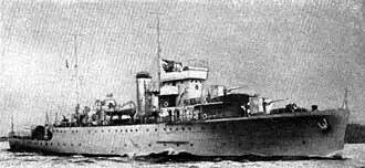 Armament consisted of three 120-millimetre (4.7 in) guns in single mounts on the ship's centreline, with two forward and one aft. Four 2-pounder (40 mm) pom-pom anti-aircraft (AA) guns were fitted, while four depth charge throwers provided an anti-submarine armament.[2] In 1943, the 40 mm guns were removed and replaced by five single-mounted 20 mm (0.79 in) AA cannon.[3]