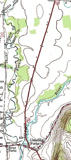 As the name implies, Unadilla Forks is the location where the Unadilla River splits into two branches. Just north of its junction with CR 18A, CR 18 crosses over the Unadilla River's eastern branch. While the east branch heads off to the northeast, CR 18 follows the west branch northward through a low-lying area in the center of the Unadilla River valley composed mostly of open fields. The west branch of the river continues north into the village of Bridgewater, a community based around the junction of NY 8 and US 20; however, CR 18 bypasses the village to the east. CR 18 intersects US 20 east of the village before crossing into Oneida County and becoming that county's CR 2.