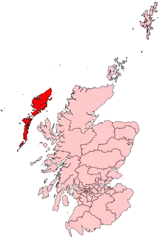 The constituency area is that of the Outer Hebrides, known also as Na h-Eileanan Siar, and has remained unchanged since its creation under the Representation of the People Act 1918 for the general election of that year. It is currently defined as being coterminous with the area of Comhairle nan Eilean Siar,[2] previously known as the Western Isles Islands Area before 1996.[3] Prior to the creation of the unitary authority, the constituency was divided between the two historic counties of Ross and Cromarty and Inverness-shire and was defined as comprising: