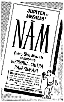 Naam was jointly produced by Jupiter Pictures and Mekala Pictures. The partners of Mekala included M. Karunanidhi, M. G. Ramachandran and V. N. Janaki. Karunanidhi wrote the screenplay, dialogue and lyrics, based on Kaadhal Kanneer, a novel by Kashi.[1] Despite this, Karunanidhi was credited for the story in the posters.[2] Ramachandran, then not the popular icon that he would later become, spelt his name onscreen as "Ramachandar" because he thought it sounded "stylish", and wanted to differentiate himself from the already established actor T. R. Ramachandran.[1]