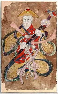 Sangsa-daewang (Sangsa in the painting) wears a very unusual turban-like headdress surrounding a white and red disc that may reflect the god's origins in the Western Regions of Central Asia.[41] Alternately, it may be a stylized form of the felt hat traditionally worn by Korean officers.[38] The red overcoat with green fringes is marked by chrysanthemum motifs in the inside and swirling cloud motifs on the fringes.[40] Sangsa holds a white or yellow[27] fan and wears black wooden shoes.[33]